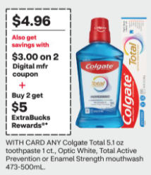 Buy (2) Colgate Total 5.1 oz toothpaste 1 ct., Optic White, Total Active Prevention or Enamel Strength mouthwash 473-500mL. $4.96 Sale Price