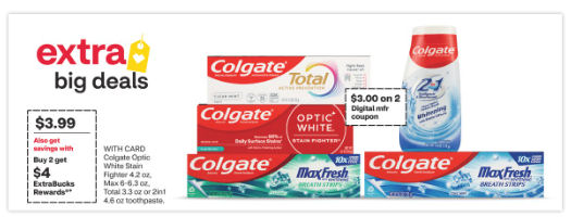 Buy (2) Colgate Optic White Stain Fighter 4.2 oz, Max 6-6.3 oz, Total 3.3 oz or 2in1 4.6 oz toothpaste $3.99 Sale Price