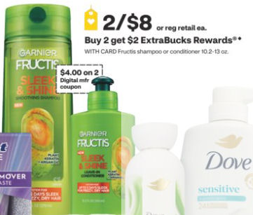 Next week you’ll earn $2 ECB for buying two select Garnier Fructis shampoos or conditioners which will be priced 2/$8. Plus a $4/2 coupon will be available to send to your card.