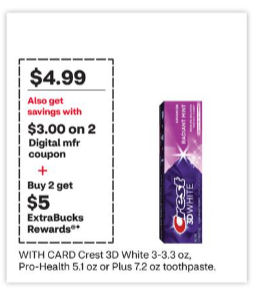 Buy (2) Crest 3D White 3-3.3 oz, Pro-Health 5.1 oz or Plus 7.2 oz toothpaste $4.99 Sale Price