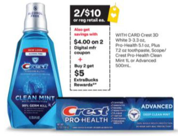 Buy (2) Crest 3D White 3-3.3 oz, Pro-Health 5.1 oz, Plus 7.2 oz toothpaste, Scope/Crest Pro-Health Clean Mint 1L or Advanced 500mL. Reg Retail or 2/$10 Sale Price